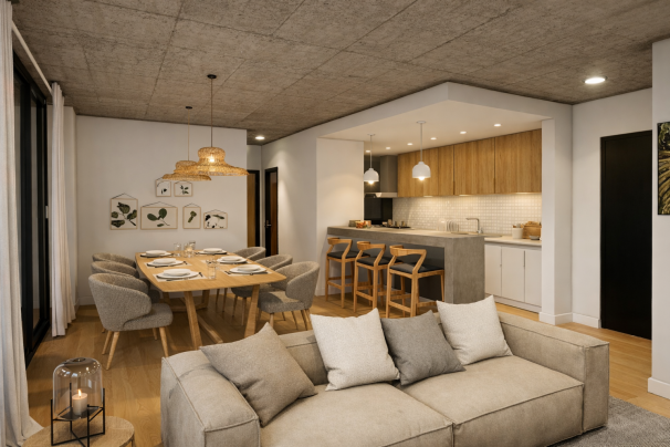Las viviendas, diseñadas con espacios abiertos que interactúan entre sí manteniendo la privacidad de cada ambiente, se distribuyen en: